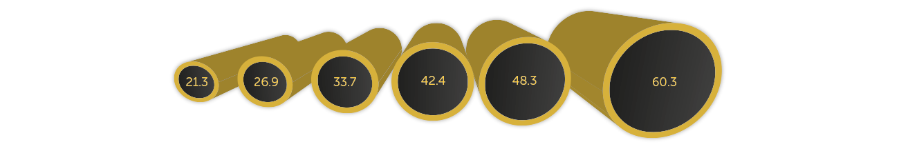 | Außendurchmesser: | 21.3 mm (½") | 26.9 mm (¾") | 33.7 mm (1") | 42.4 mm (1¼") | 48.3 mm (1½") | 60.3 mm (2") | 25x25 | 40x40 |